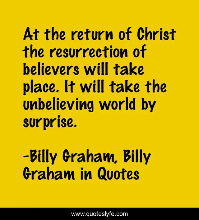 This page presents the quote "At the return of Christ the resurrection of believers will take place. It will take the unbelieving world by surprise.". Author of this quote is Billy Graham, Billy Graham in Quotes. This quote is about resurrection, billy-graham,.