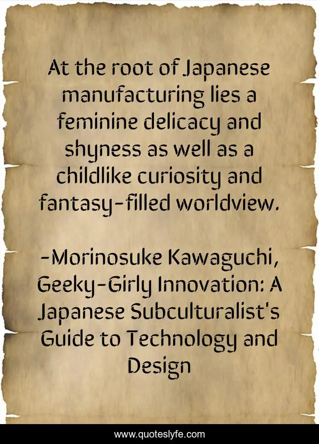 "Morinosuke Kawaguchi, Geeky-Girly Innovation: A Japanese Subculturalist's Guide to Technology and Design Quotes." Quoteslyfe.com, 2025. Tue. 09 Dec. 2025. <https://www.quoteslyfe.com/quote/At-the-root-of-Japanese-manufacturing-lies-137599>.
