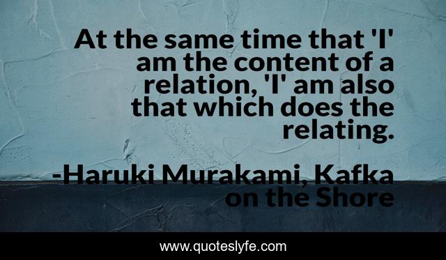 This page presents the quote "At the same time that 'I' am the content of a relation, 'I' am also that which does the relating.". Author of this quote is Haruki Murakami, Kafka on the Shore. .