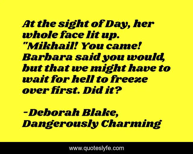 This page presents the quote "At the sight of Day, her whole face lit up. "Mikhail! You came! Barbara said you would, but that we might have to wait for hell to freeze over first. Did it?". Author of this quote is Deborah Blake, Dangerously Charming. This quote is about baba-yagas, fairy-tales, witches, paranormal-urban-fantasy-romance,.