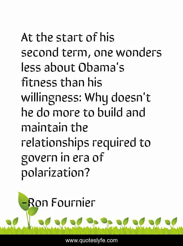 This page presents the quote "At the start of his second term, one wonders less about Obama's fitness than his willingness: Why doesn't he do more to build and maintain the relationships required to govern in era of polarization?". Author of this quote is Ron Fournier. This quote is about relationships, start, why,.