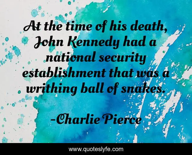 This page presents the quote "At the time of his death, John Kennedy had a national security establishment that was a writhing ball of snakes.". Author of this quote is Charlie Pierce. This quote is about security, time,.