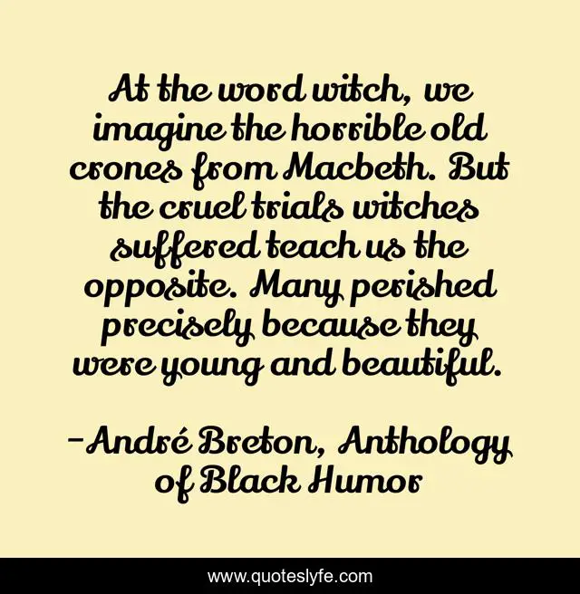 This page presents the quote "At the word witch, we imagine the horrible old crones from Macbeth. But the cruel trials witches suffered teach us the opposite. Many perished precisely because they were young and beautiful.". Author of this quote is André Breton, Anthology of Black Humor. This quote is about suffering, witch,.