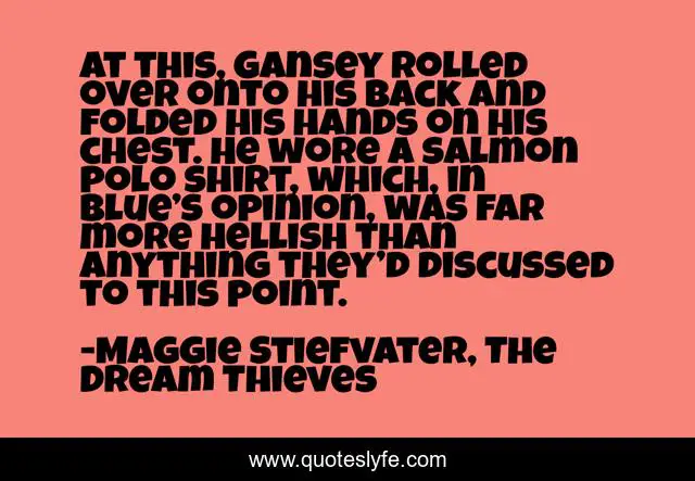 This page presents the quote "At this, Gansey rolled over onto his back and folded his hands on his chest. He wore a salmon polo shirt, which, in Blue’s opinion, was far more hellish than anything they’d discussed to this point.". Author of this quote is Maggie Stiefvater, The Dream Thieves. This quote is about funny, richard-gansey-iii, comedy, blue-sargent,.
