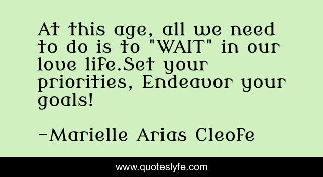 This page presents the quote "At this age, all we need to do is to "WAIT" in our love life.Set your priorities, Endeavor your goals!". Author of this quote is Marielle Arias Cleofe. This quote is about love, priorities, goals, endeavor, affection, wait,.
