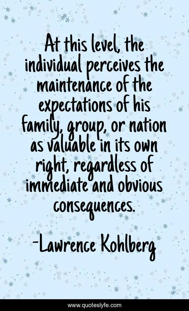 This page presents the quote "At this level, the individual perceives the maintenance of the expectations of his family, group, or nation as valuable in its own right, regardless of immediate and obvious consequences.". Author of this quote is Lawrence Kohlberg. This quote is about group, expectations,.