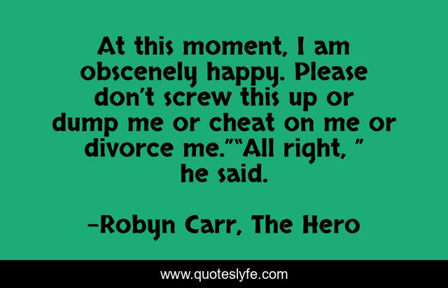 This page presents the quote "At this moment, I am obscenely happy. Please don’t screw this up or dump me or cheat on me or divorce me.”“All right, ” he said.". Author of this quote is Robyn Carr, The Hero. This quote is about romance, contemporary-romance,.