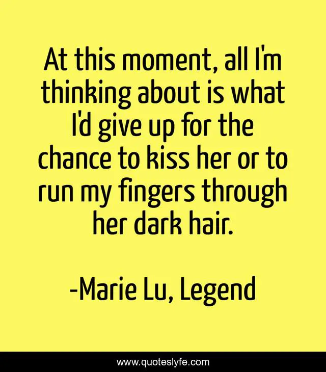 This page presents the quote "At this moment, all I'm thinking about is what I'd give up for the chance to kiss her or to run my fingers through her dark hair.". Author of this quote is Marie Lu, Legend. This quote is about hair, june, day, kiss,.