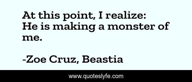 This page presents the quote "At this point, I realize: He is making a monster of me.". Author of this quote is Zoe Cruz, Beastia. This quote is about creating-a-monster, kidnapping, pain, monster, torture, point, abduction, modification, fear,.
