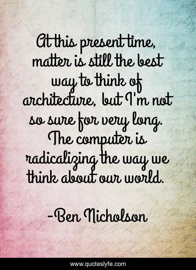 This page presents the quote "At this present time, matter is still the best way to think of architecture, but I'm not so sure for very long. The computer is radicalizing the way we think about our world.". Author of this quote is Ben Nicholson. This quote is about world, best, time,.