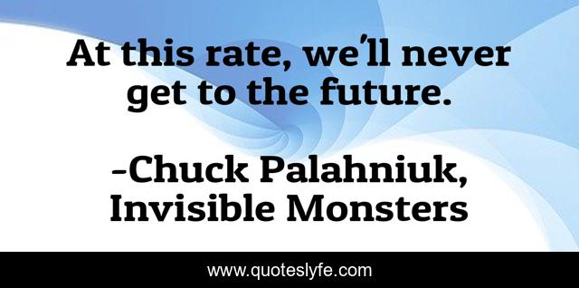 This page presents the quote "At this rate, we'll never get to the future.". Author of this quote is Chuck Palahniuk, Invisible Monsters. .