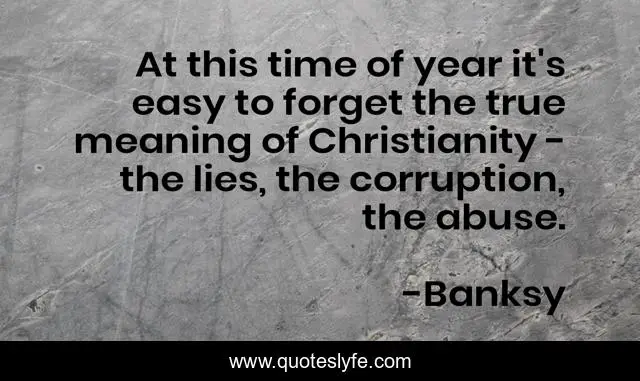 This page presents the quote "At this time of year it's easy to forget the true meaning of Christianity - the lies, the corruption, the abuse.". Author of this quote is Banksy. This quote is about priest, art, sarcasm, christianity, religion, abuse, christmas,.