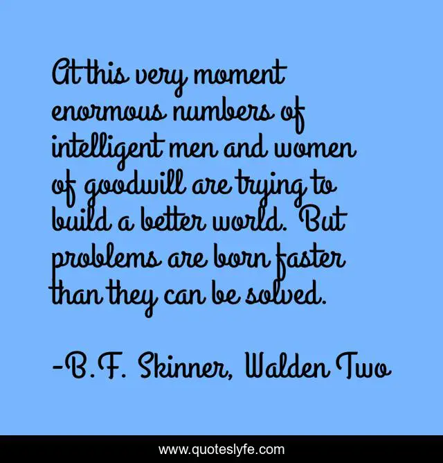 This page presents the quote "At this very moment enormous numbers of intelligent men and women of goodwill are trying to build a better world. But problems are born faster than they can be solved.". Author of this quote is B.F. Skinner, Walden Two. This quote is about better-world, change, goodwill,.