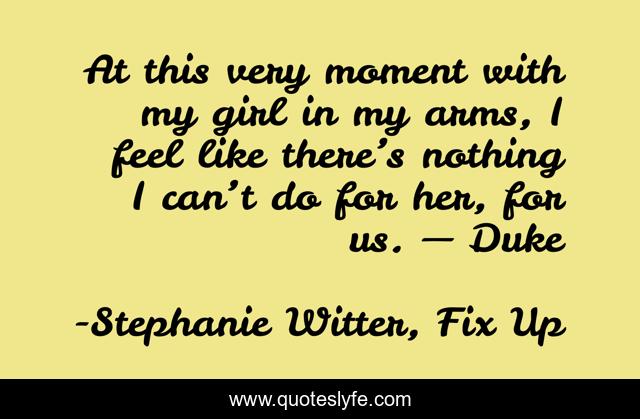 This page presents the quote "At this very moment with my girl in my arms, I feel like there’s nothing I can’t do for her, for us. — Duke". Author of this quote is Stephanie Witter, Fix Up. This quote is about new-adult, patch-up-series, contemporary-romance, contemporary, duke-ashdown, romance, fix-up, college, college-romance,.
