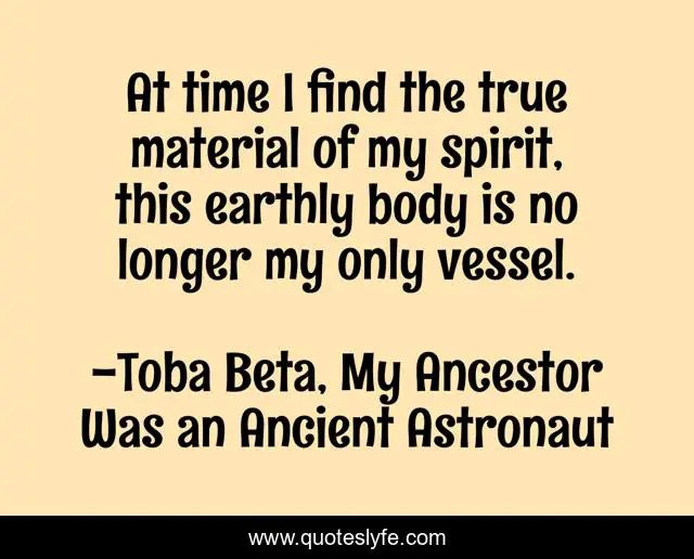 This page presents the quote "At time I find the true material of my spirit, this earthly body is no longer my only vessel.". Author of this quote is Toba Beta, My Ancestor Was an Ancient Astronaut. This quote is about eternity, heaven,.