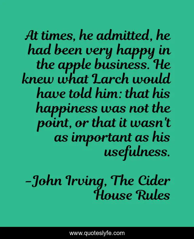 This page presents the quote "At times, he admitted, he had been very happy in the apple business. He knew what Larch would have told him: that his happiness was not the point, or that it wasn't as important as his usefulness.". Author of this quote is John Irving, The Cider House Rules. This quote is about meaning-of-life, purpose,.