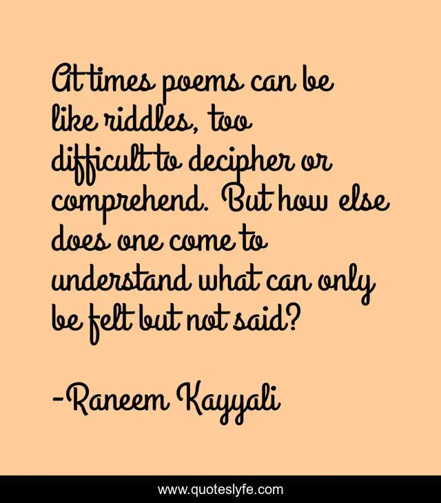 This page presents the quote "At times poems can be like riddles, too difficult to decipher or comprehend. But how else does one come to understand what can only be felt but not said?". Author of this quote is Raneem Kayyali. This quote is about poems, poetry,.