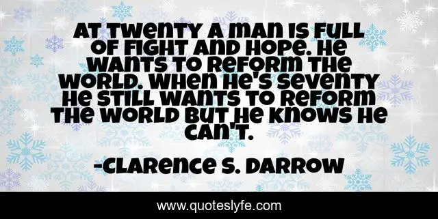 This page presents the quote "At twenty a man is full of fight and hope. He wants to reform the world. When he's seventy he still wants to reform the world but he knows he can't.". Author of this quote is Clarence S. Darrow. .