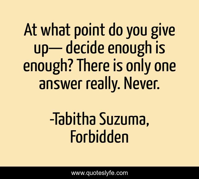 This page presents the quote "At what point do you give up— decide enough is enough? There is only one answer really. Never.". Author of this quote is Tabitha Suzuma, Forbidden. This quote is about forbidden, tragedy, tabitha-suzuma,.