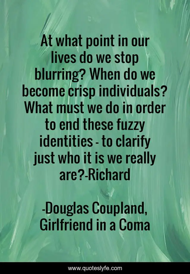 This page presents the quote "At what point in our lives do we stop blurring? When do we become crisp individuals? What must we do in order to end these fuzzy identities - to clarify just who it is we really are?-Richard". Author of this quote is Douglas Coupland, Girlfriend in a Coma. This quote is about life, hope, identity,.