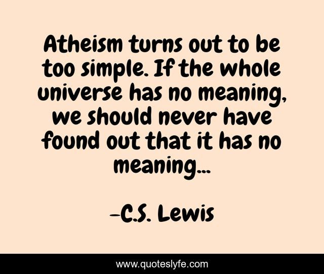 This page presents the quote "Atheism turns out to be too simple. If the whole universe has no meaning, we should never have found out that it has no meaning...". Author of this quote is C.S. Lewis. This quote is about atheism, religion,.