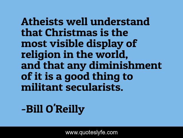 This page presents the quote "Atheists well understand that Christmas is the most visible display of religion in the world, and that any diminishment of it is a good thing to militant secularists.". Author of this quote is Bill O'Reilly. This quote is about religion, good, world,.