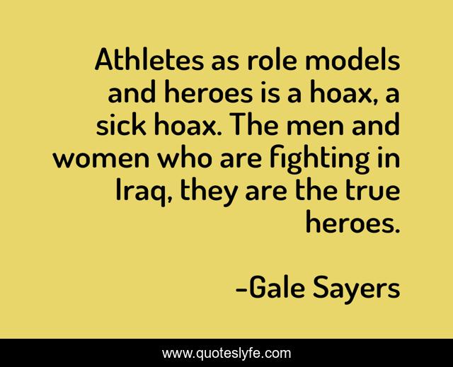 This page presents the quote "Athletes as role models and heroes is a hoax, a sick hoax. The men and women who are fighting in Iraq, they are the true heroes.". Author of this quote is Gale Sayers. This quote is about heroes, men, sick,.