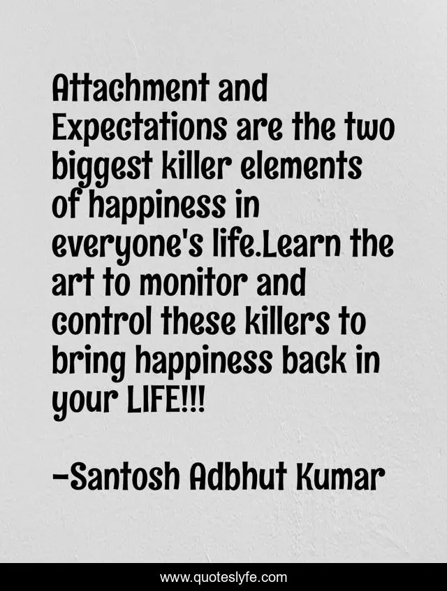This page presents the quote "Attachment and Expectations are the two biggest killer elements of happiness in everyone's life.Learn the art to monitor and control these killers to bring happiness back in your LIFE!!!". Author of this quote is Santosh Adbhut Kumar. This quote is about life, adbhut, killer, expectations, attachment, happiness,.