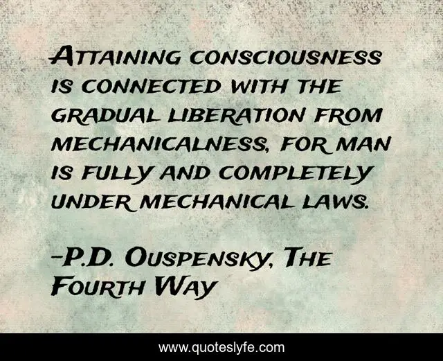 This page presents the quote "Attaining consciousness is connected with the gradual liberation from mechanicalness, for man is fully and completely under mechanical laws.". Author of this quote is P.D. Ouspensky, The Fourth Way. This quote is about philosophy, metaphysics,.