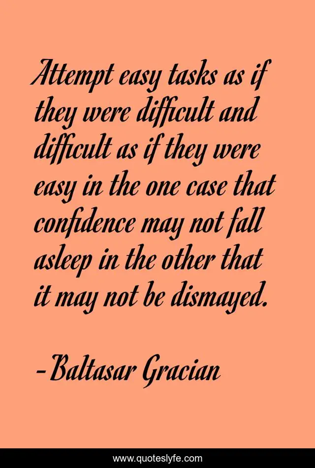 This page presents the quote "Attempt easy tasks as if they were difficult and difficult as if they were easy in the one case that confidence may not fall asleep in the other that it may not be dismayed.". Author of this quote is Baltasar Gracian. This quote is about positive, confidence,.