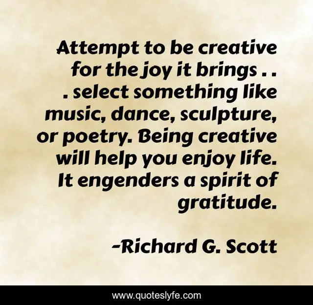 This page presents the quote "Attempt to be creative for the joy it brings . . . select something like music, dance, sculpture, or poetry. Being creative will help you enjoy life. It engenders a spirit of gratitude.". Author of this quote is Richard G. Scott. This quote is about gratitude, joy, creativity,.