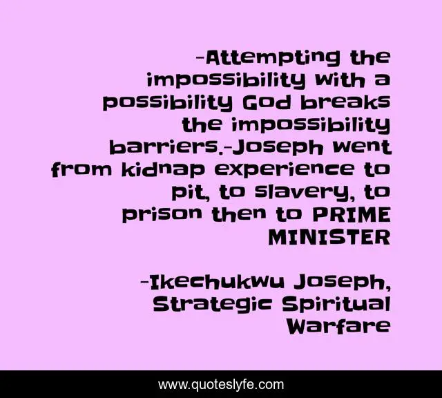 This page presents the quote "-Attempting the impossibility with a possibility God breaks the impossibility barriers.-Joseph went from kidnap experience to pit, to slavery, to prison then to PRIME MINISTER". Author of this quote is Ikechukwu Joseph, Strategic Spiritual Warfare. This quote is about prayer-life, self-help-book, life-and-sayings,.