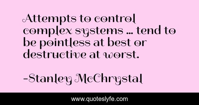 This page presents the quote "Attempts to control complex systems … tend to be pointless at best or destructive at worst.". Author of this quote is Stanley McChrystal. .