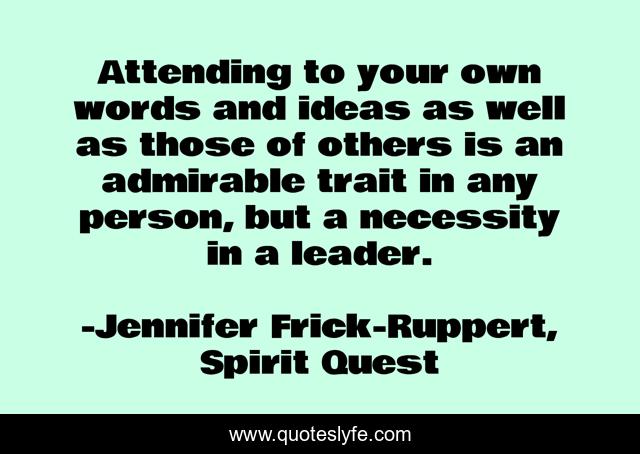 This page presents the quote "Attending to your own words and ideas as well as those of others is an admirable trait in any person, but a necessity in a leader.". Author of this quote is Jennifer Frick-Ruppert, Spirit Quest. This quote is about questions, question-everything, middle-grade, native-american, admirable-qualities, middle-grade-reads, traits, cheif, words,.