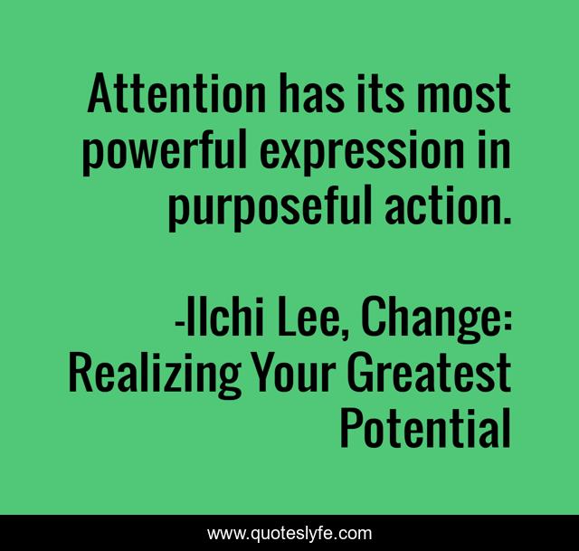 This page presents the quote "Attention has its most powerful expression in purposeful action.". Author of this quote is Ilchi Lee, Change: Realizing Your Greatest Potential. This quote is about enthusiasm, inspirational, self-development,.
