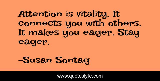 This page presents the quote "Attention is vitality. It connects you with others. It makes you eager. Stay eager.". Author of this quote is Susan Sontag. This quote is about attention, eagerness,.