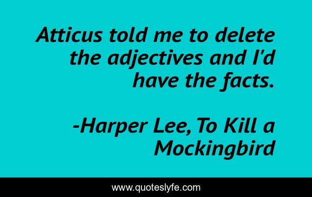 This page presents the quote "Atticus told me to delete the adjectives and I'd have the facts.". Author of this quote is Harper Lee, To Kill a Mockingbird. .