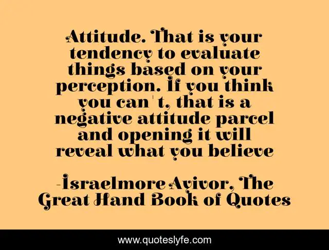 This page presents the quote "Attitude. That is your tendency to evaluate things based on your perception. If you think you can't, that is a negative attitude parcel and opening it will reveal what you believe". Author of this quote is Israelmore Ayivor, The Great Hand Book of Quotes. This quote is about conclude, attitude, open, tendency, food-for-thought, positive, what-is-attitude, negative, negative-attitude,.