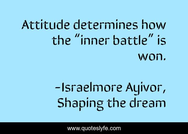 This page presents the quote "Attitude determines how the “inner battle” is won.". Author of this quote is Israelmore Ayivor, Shaping the dream. This quote is about food-for-thought, winner, win, within, life, battles, behaviour, attitude, won,.