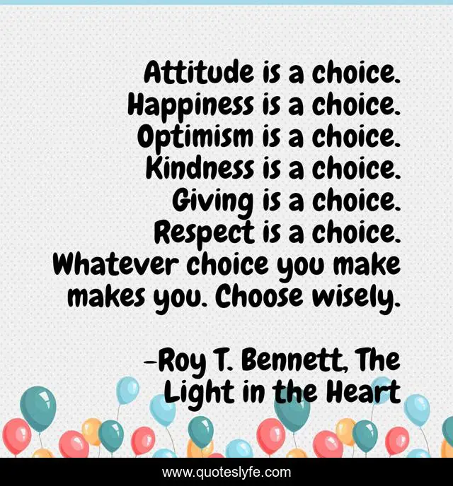 "Roy T. Bennett, The Light in the Heart Quotes." Quoteslyfe.com, 2025. Fri. 05 Dec. 2025. <https://www.quoteslyfe.com/quote/Attitude-is-a-choice-Happiness-is-a-1923>.