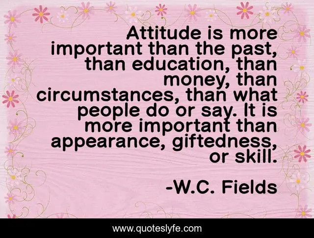 This page presents the quote "Attitude is more important than the past, than education, than money, than circumstances, than what people do or say. It is more important than appearance, giftedness, or skill.". Author of this quote is W.C. Fields. This quote is about behaviour, attitude, education, skill, circumstances,.
