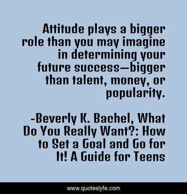 This page presents the quote "Attitude plays a bigger role than you may imagine in determining your future success—bigger than talent, money, or popularity.". Author of this quote is Beverly K. Bachel, What Do You Really Want?: How to Set a Goal and Go for It! A Guide for Teens. This quote is about parenting, parenting-teens, nonfiction, inspirational, enthusiasm, nonfiction-self-help, young-adult, teens,.