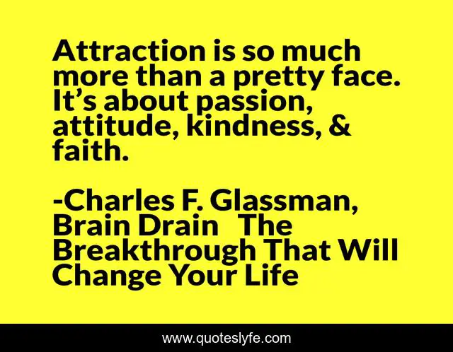 This page presents the quote "Attraction is so much more than a pretty face. It’s about passion, attitude, kindness, & faith.". Author of this quote is Charles F. Glassman, Brain Drain The Breakthrough That Will Change Your Life. This quote is about passion-for-life, attraction, kindness, passion,.