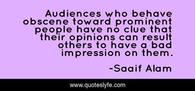 This page presents the quote "Audiences who behave obscene toward prominent people have no clue that their opinions can result others to have a bad impression on them.". Author of this quote is Saaif Alam. This quote is about media, ethics, morality,.