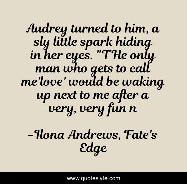 This page presents the quote "Audrey turned to him, a sly little spark hiding in her eyes. "THe only man who gets to call me'love' would be waking up next to me after a very, very fun n". Author of this quote is Ilona Andrews, Fate's Edge. This quote is about funny, fate-s-edge, the-edge, ilona-andrews, audrey, kaldar, fun, comedy,.