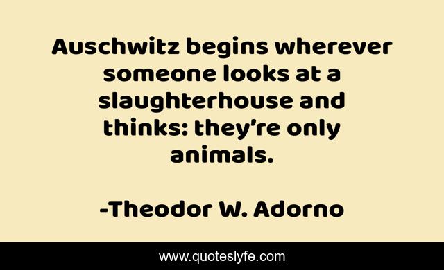 This page presents the quote "Auschwitz begins wherever someone looks at a slaughterhouse and thinks: they’re only animals.". Author of this quote is Theodor W. Adorno. This quote is about theodor-w-adorno, animals, animal-rights, animal-cruelty,.
