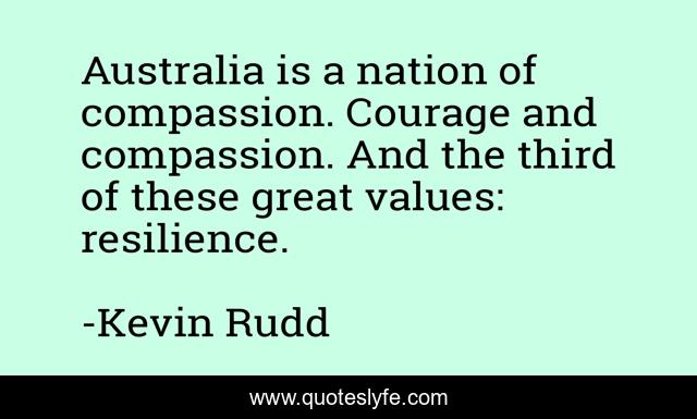 This page presents the quote "Australia is a nation of compassion. Courage and compassion. And the third of these great values: resilience.". Author of this quote is Kevin Rudd. This quote is about compassion, great,.
