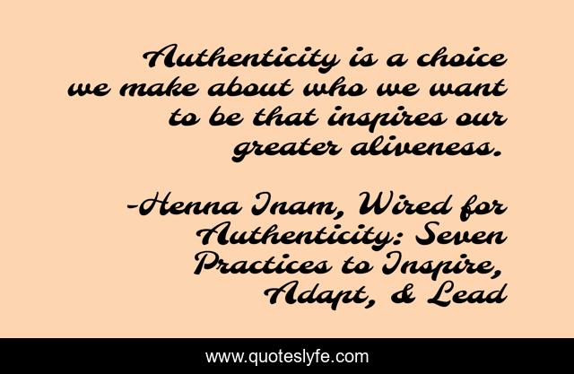 This page presents the quote "Authenticity is a choice we make about who we want to be that inspires our greater aliveness.". Author of this quote is Henna Inam, Wired for Authenticity: Seven Practices to Inspire, Adapt, & Lead. This quote is about inspiration, authenticity, choices-and-attitude, choices,.