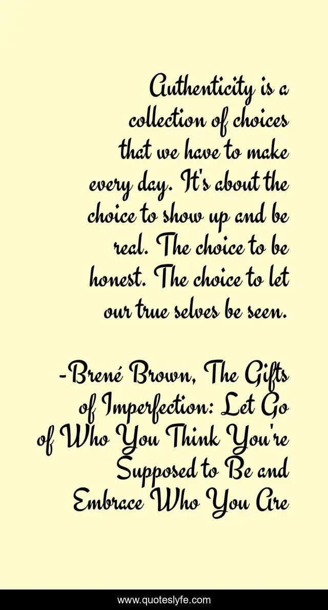 "Brené Brown, The Gifts of Imperfection: Let Go of Who You Think You're Supposed to Be and Embrace Who You Are Quotes." Quoteslyfe.com, 2025. Fri. 05 Dec. 2025. <https://www.quoteslyfe.com/quote/Authenticity-is-a-collection-of-choices-that-250421>.