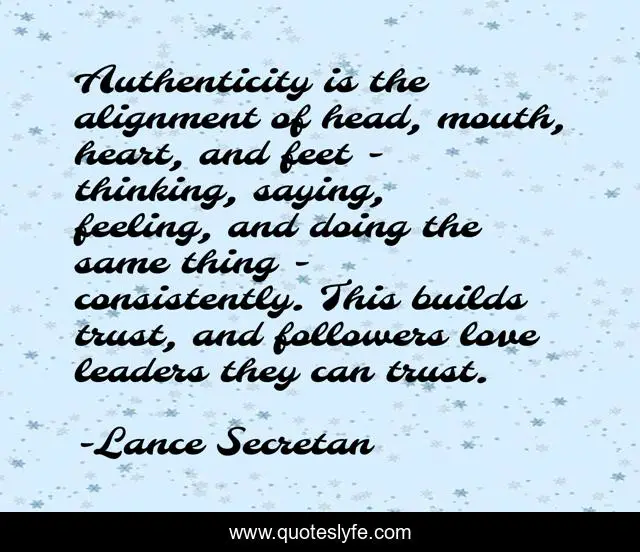 This page presents the quote "Authenticity is the alignment of head, mouth, heart, and feet - thinking, saying, feeling, and doing the same thing - consistently. This builds trust, and followers love leaders they can trust.". Author of this quote is Lance Secretan. This quote is about thinking, heart, love, affection,.